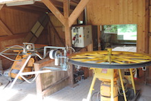 wie wir in besprochen hatten. Am 30. Juni 2014 mussten wir den 50 kg schweren Umformer wieder an die Erzeugerfirma Firma Bruckschlögl, Bad Goisern, nach mehreren e-Mails und Telefongesprächen zurück schicken, um in umzubauen mit genauer Erklärung, was wir wollten. Nach drei Wochen wurde der Schaltkasten wieder zugestellt. Der Klemmkasten für die Umlenkung war wieder nicht in Ordnung und wurde nach Rücksprache wieder zurück geschickt. Endlich wollten wir in Betrieb gehen, aber der nächste Rückschlag. Der neue vorgeschriebene Fehlerstromschutzschalter Type B löste sofort aus. Es dauerte bis zum 4.Oktober 2014 bis uns die Fa. Bruckschlögl einen anderen FI/B der Marke ABB schickte, den wir einbauten und der Lift läuft. Die Überfahrsicherungen mussten neu installiert werden, auf unsere Verhältnisse abgestimmt. Der Lift läuft noch immer nicht richtig. Die Geschwindigkeit lässt sich nur von 50Hz auf 30Hz regeln, nicht aber auf richtige 25Hz.